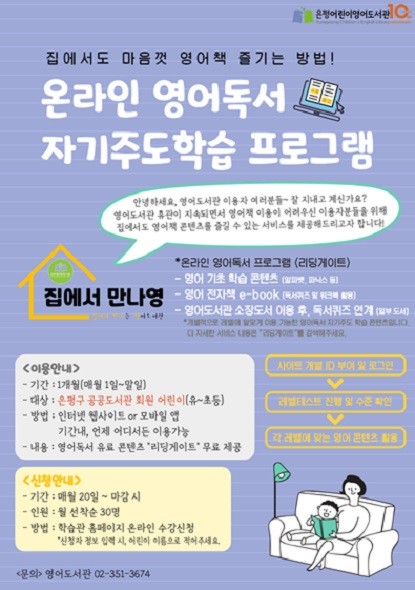 [열린의정뉴스 = 김진성 기자] 은평구(구청장 김미경)와 은평어린이영어도서관(은평구평생학습관장 이창식)은 코로나19로 도서관 휴관이 장기화됨에 따라 주민들이 집에서도 영어독서활동을 할 수 있도록 10월부터 12월 말까지 <온라인 영어독서 자기주도학습 프로그램>을 도입하여 운영한다.