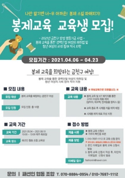 [열린의정뉴스 = 김진성 기자]서울 금천구(구청장 유성훈)는 '2021년 양성평등기금 지원 공모사업'에 선정된 패션인협동조합이 여성의 사회참여 활성화 지원을 위해 '봉제 인력 양성과정' 교육생을 오는 23일까지 모집한다고 밝혔다.