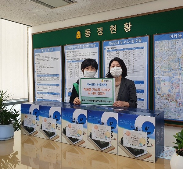 ▶이화동주민센터는 새마을부녀회와 함께 소외된 이웃들이 따뜻한 명절을 보낼 수 있도록 저소득 주민들에게 김 세트 전달을 완료했다. 이화동 새마을부녀회는 그간 바자회를 통한 수익금으로 저소득 어르신을 위한 밑반찬, 동지팥죽, 김장김치, 삼계탕 나눔 등을 주도하며 지역 내 사랑나눔활동을 전개한 바 있다.
