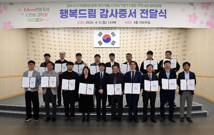 [코리아 이슈저널=김종오 기자] 김제시는 6일 시청 대회의실에서 ‘다자녀가정⇔기업․단체 행복드림 매칭사업’에 참여한 후원업체 대표 및 관계자들을 초청해 감사증서를 전달했다고 밝혔다.