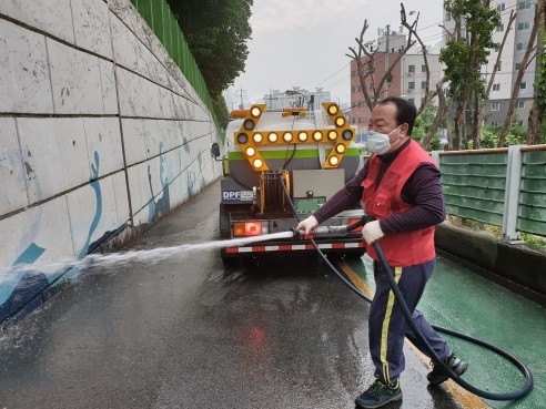 [포토] 등굣길 물청소 및 교실 소독방역을 실시 - 코리아 이슈저널