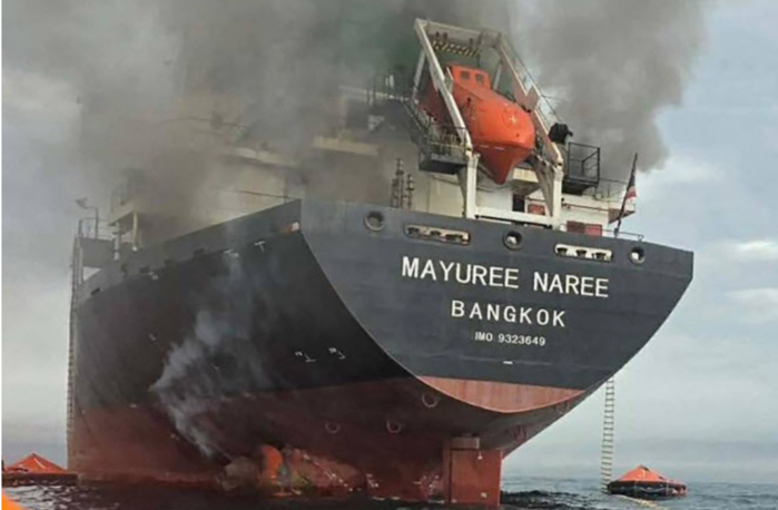 | ▲이란 공격으로 불이 붙은 태국 선적 마유리나리호, (뉴시스 출처) |