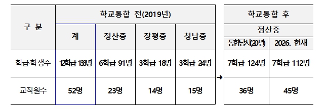 정산중학교는 1952년 개교 이후, 2020년 인근 청남중학교와 장평중학교를 통합해 기숙형 중학교로 재편·운영 중이다. 해당 학교는 통합 후 우수한 교육환경을 바탕으로 체계적인 교육과정을 운영하고 다양한 교육 프로그램을 제공함으로써 작은학교 혁신의 대표적 우수사례로 평가받고 있다.