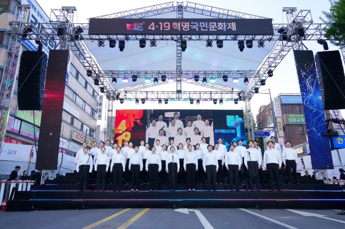 | ▲ 18일 ‘4·19혁명국민문화제 2026’ 전야제 공식행사에서 강북구립연합합창단이 ‘4·19의 노래’를 합창하고 있다. |
