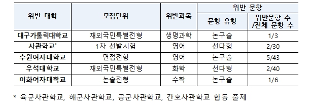대구가톨릭대학교는 생명과학 1문항, 사관학교는 영어 2문항, 수원여자대학교는 영어 5문항, 우석대학교는 화학 2문항, 이화여자대학교는 수학 1문항이 고등학교 교육과정 범위를 위반한 것으로 나타났다. 위반 문항 비율은 대학별고사를 시행한 전체 대학의 문항 중 0.3%였다.