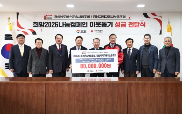 [코리아 이슈저널=김태훈 기자] 경상남도는 29일 도청 소회의실에서 경남버스운송사업조합(이사장 양기환)과 경남지역자동차노동조합(위원장 박지훈)이 도내 취약계층을 돕기 위한 성금 8천만 원을 전달했다고 밝혔다.