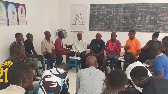 | ▲신천지예수교회 다대오지파 아프리카 라이베리아지역 센터에서 수강생들이 소그룹으로 모여 서로의 깨달음을 나누고 있다. |