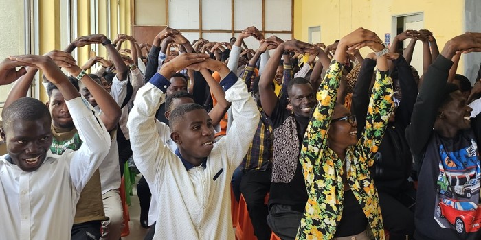 | ▲신천지예수교회 바돌로매 아프리카 잠비아 루사카지역센터에서 수강생들이 O/X 퀴즈 수업에서 머리 위로 두 팔을 모아 ‘O’ 자를 만들며 활짝 웃고 있다. |