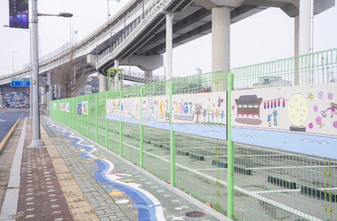주요 사업 내용으로, 계양아라온 북단에서 황어장터 역사문화센터까지 이어지는 보행 구간에 ‘바닥 유도선’을 설치했다. 구간 내 노후한 주차장 펜스에 ‘계양의 사계’를 주제로 한 디자인 벽화를 조성하여 보행 환경을 조성했다.
